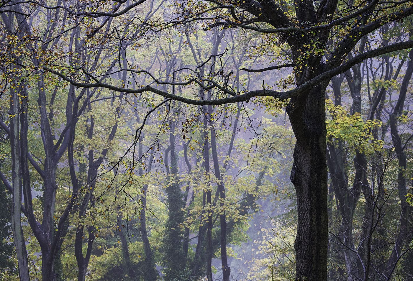 A feature that is sometimes not always appreciated when photographing in the rain is that it has the appearance of a light fog. Even in daytime, when it is raining the lighting often requires the use of a relatively slow shutter speed, (in this example I used a shutter speed of 1 second), therefore the movement of the rain becomes blurred. What it does create however is a pleasing sense of a tonal recession, as the middle distance appears much paler than those elements closer to the camera. This impression is exaggerated by the dramatic tonality and colour saturation of the trees nearest the camera. One of the obvious advantages of using a long lens is that they come equipped with deep lens-hoods, which helps to keep the front element dry.