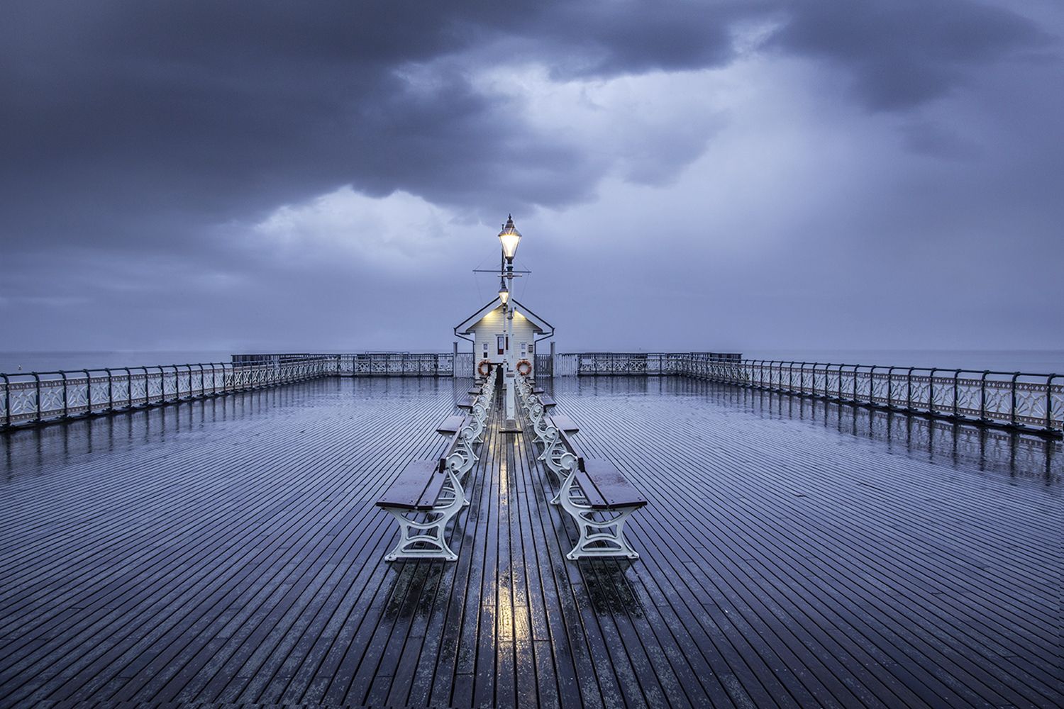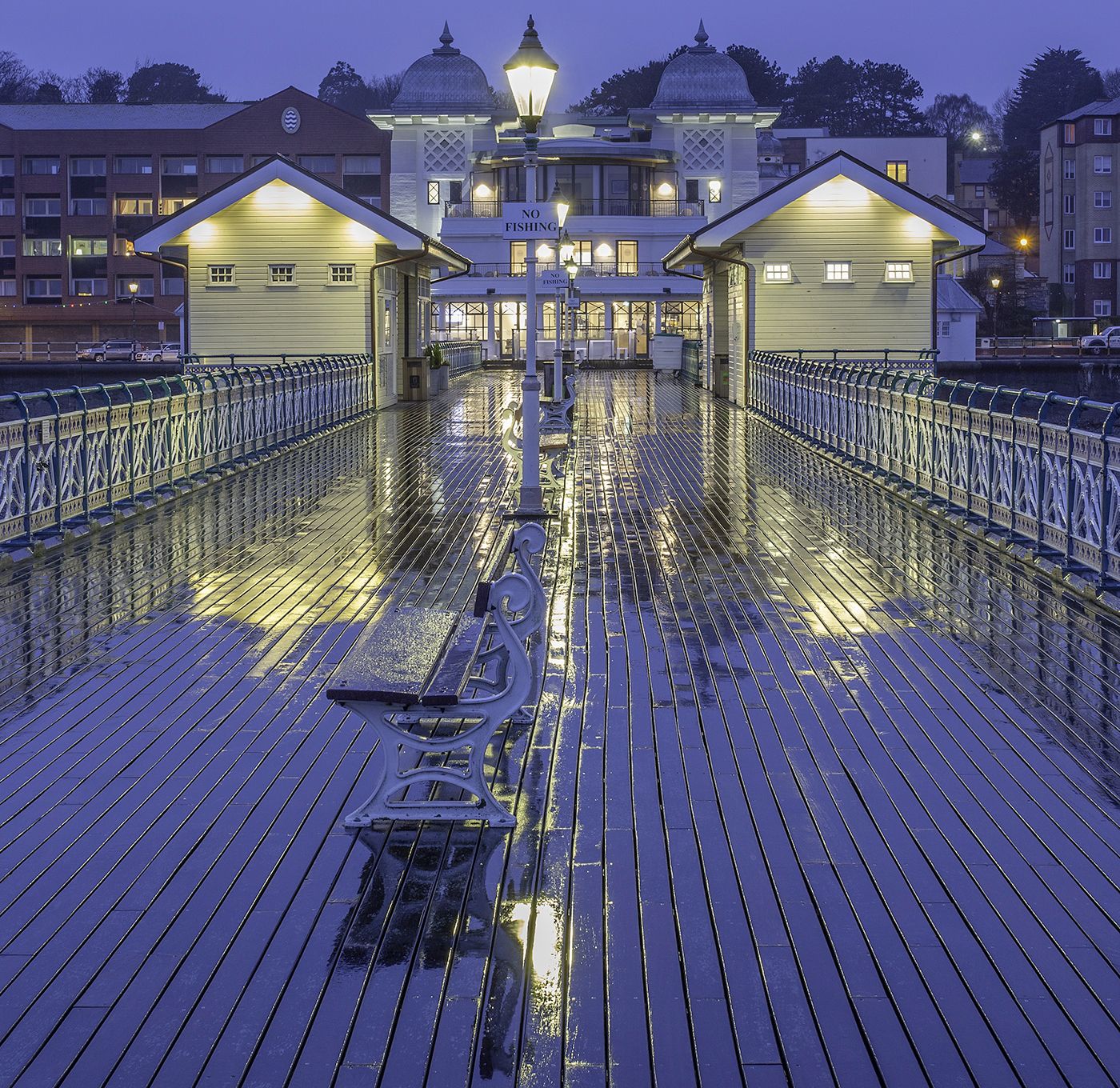 The combination of night-time and rain can often provide some of the best conditions for photography, particularly if there is adjacent lighting nearby. Jetties and piers can make excellent subjects to photograph, particularly if they are constructed of wood, as this tends to be resinous, (which is designed to repel water), making is much more reflective when it does rain. On this particular evening it was pouring down and quite windy. Fortunately when we were photographing this particular pier there was a kiosk half-way down where we could shelter. Initially we set my wife’s camera on a tripod and I followed her with a large umbrella, (a Fotospeed umbrella I hasten to add), ensuring that her equipment remained dry as she took her shots. We then retreated to the kiosk, reversed roles and I was able take mine. Often teamwork really can be a help.